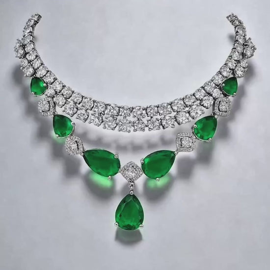 Discover the Emerald Enchante Necklace Set — a stunning rhodium-plated 925 silver design with emerald impersonation stones and zircons, perfect for brides, weddings, anniversaries, and elegant occasions.