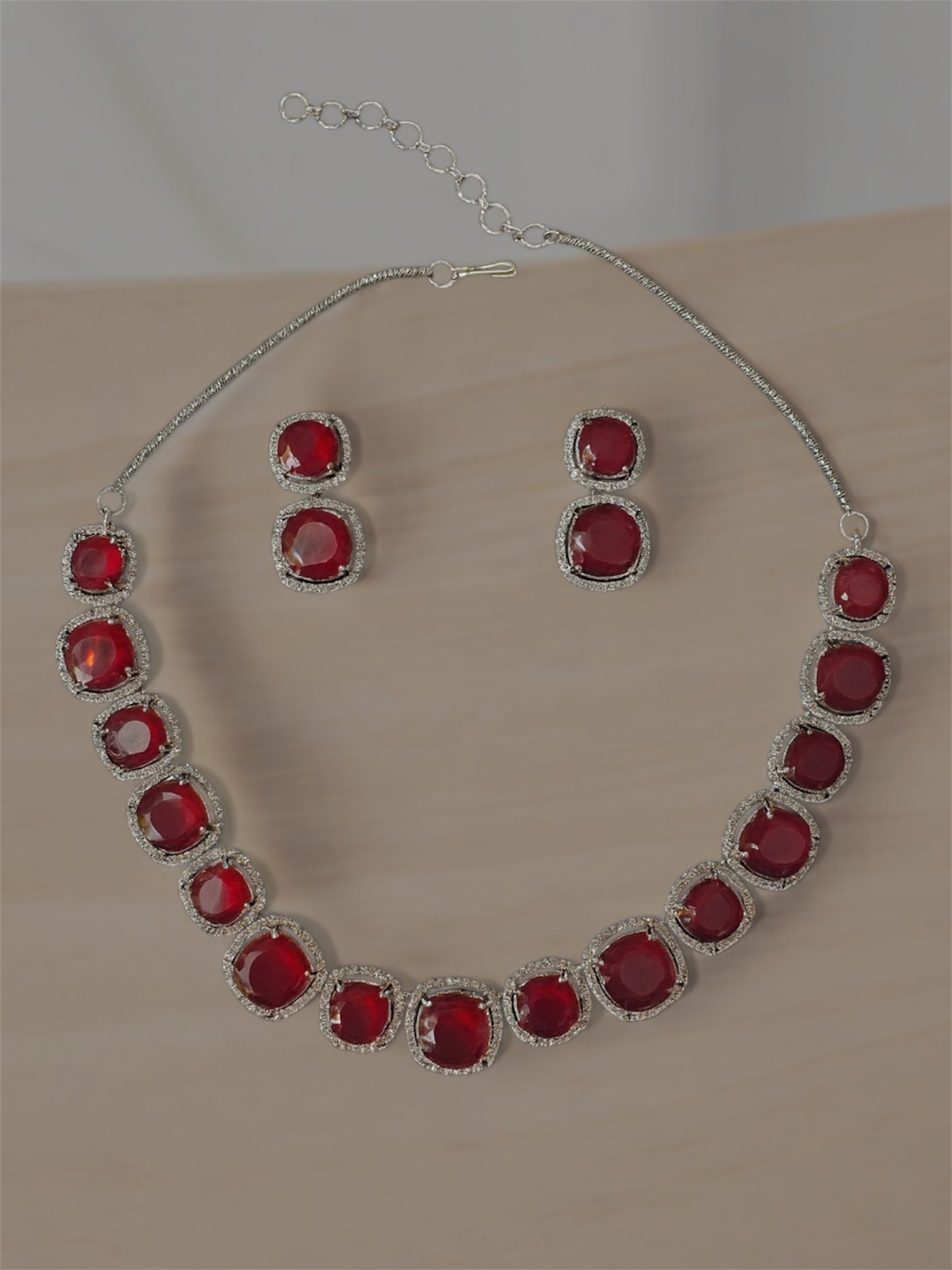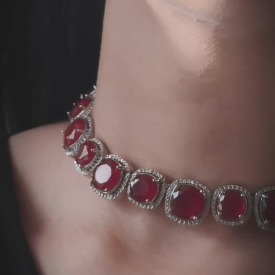 A timeless jewellery set inspired by the grandeur of the Ottoman era. Featuring cushion-cut imitation rubies set in 925 sterling silver with rhodium plating for extra shine and durability.