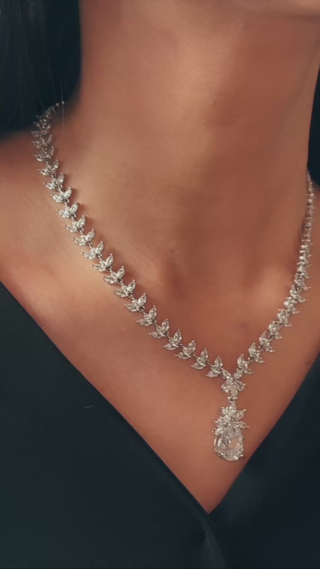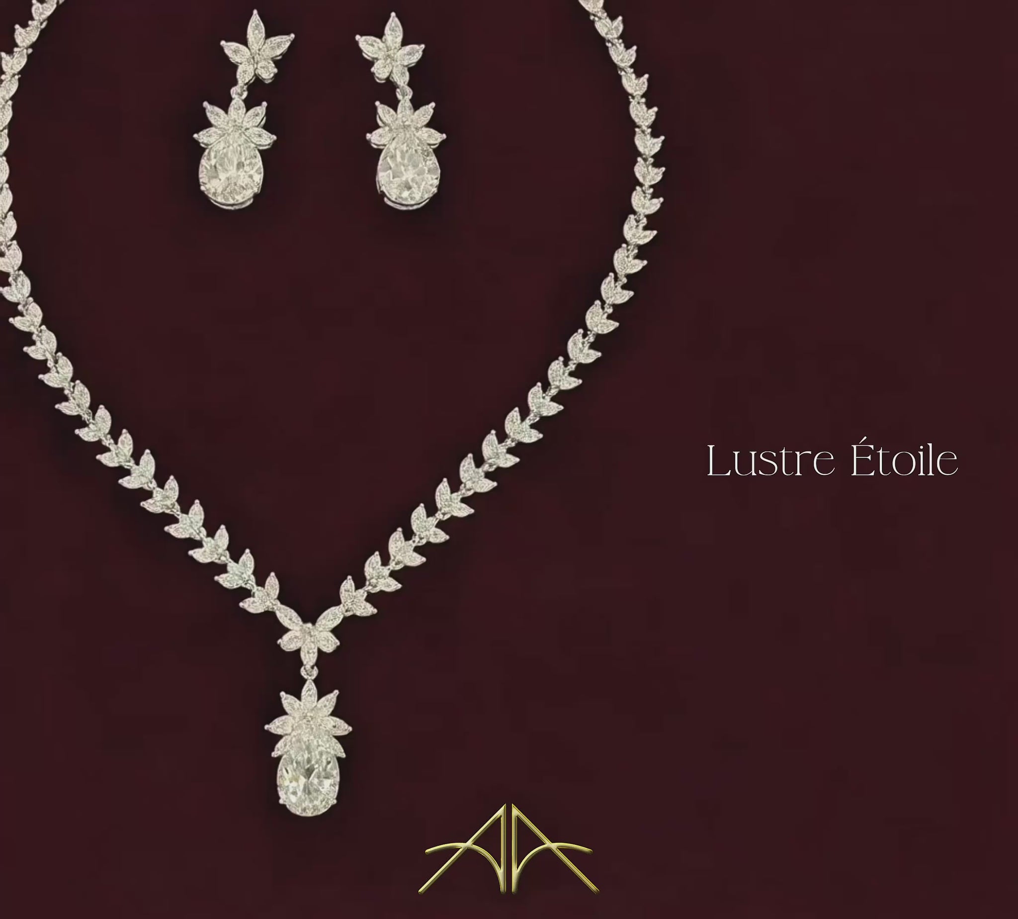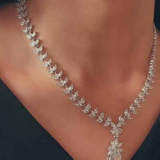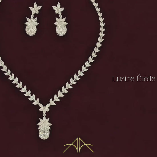 The necklace and earrings resemble blooming floral motifs with a radiant teardrop centrepiece, evoking both nature and luxury.