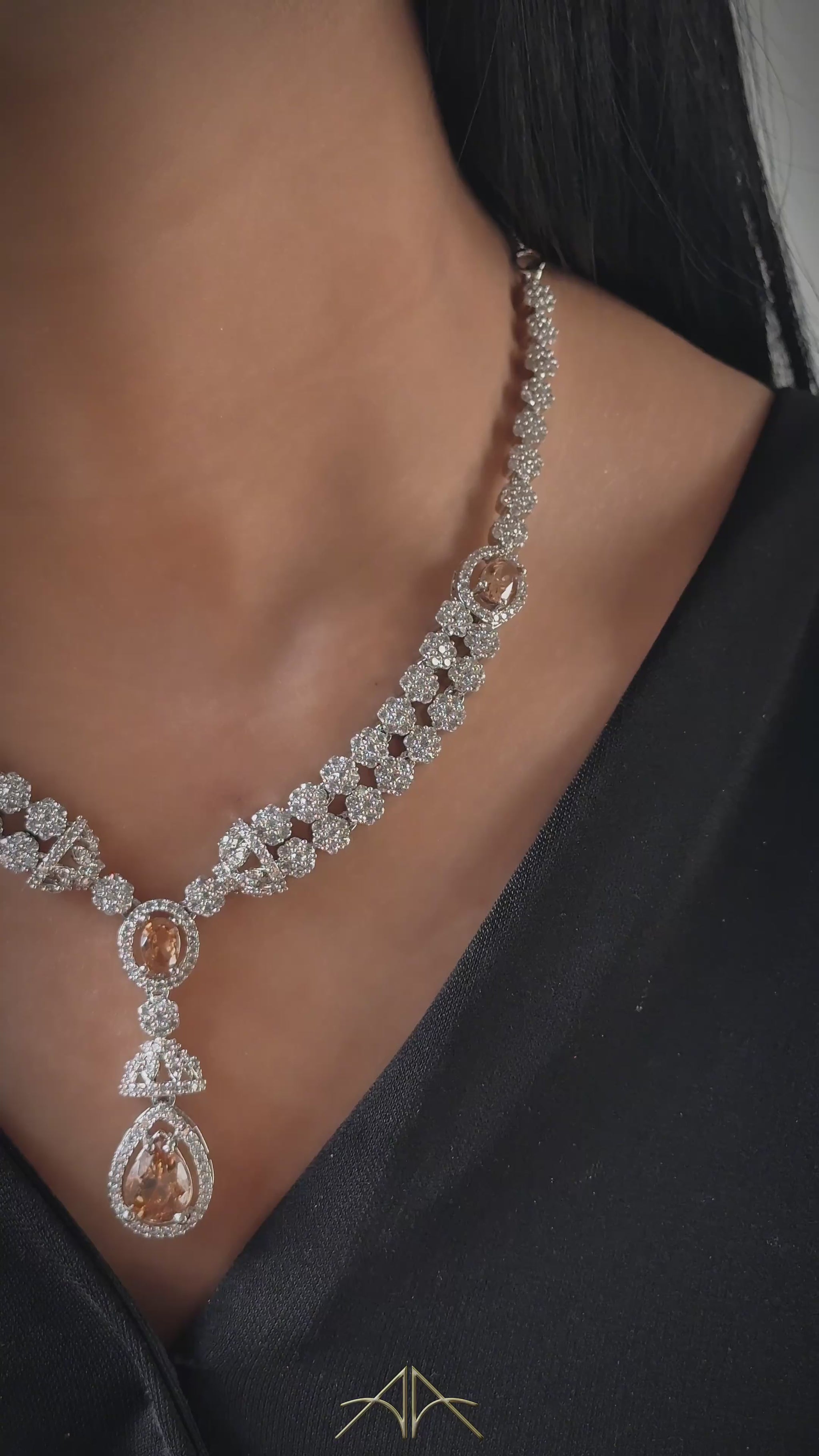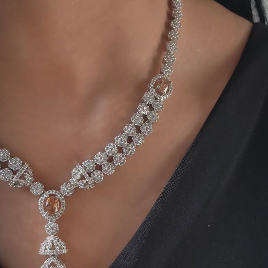 Elegant 925 silver necklace and earrings set, rhodium plated with champagne-blush imitation stones and micro-set zircon detailing. Perfect for weddings, formal events, and bridal wear. Hand-crafted with luxurious brilliance.